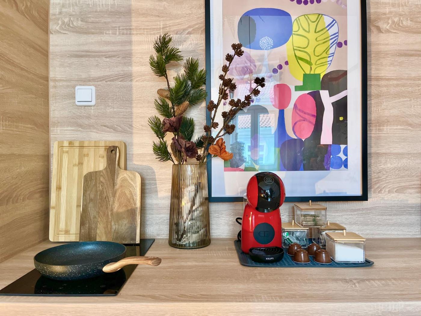 One-Bedroom Apartment. The well-equipped kitchen features a stovetop, a refrigerator and kitchenware. The apartment offers a flat-screen TV with streaming services, a tea and coffee maker, a seating area, a dining area as well as a quiet street view. The unit offers 1 bed.