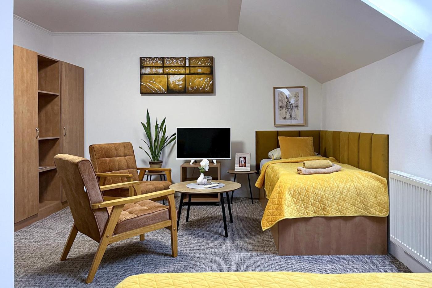 Quadruple Room. Featuring free toiletries, this quadruple room includes a private bathroom with a shower. The quadruple room features a flat-screen TV with cable channels, a seating area, a wardrobe, a sofa as well as a quiet street view. The unit has 3 beds.